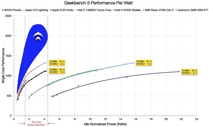 上图来自 AnandTech,展示了近几年旗舰 SoC 们的能耗表现,纵轴为性能,越高越好,横轴为能耗,越低越好,也就是说,点的大小代表单位时间功耗,单位为 W。